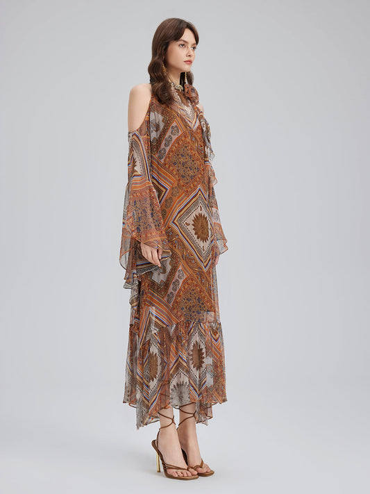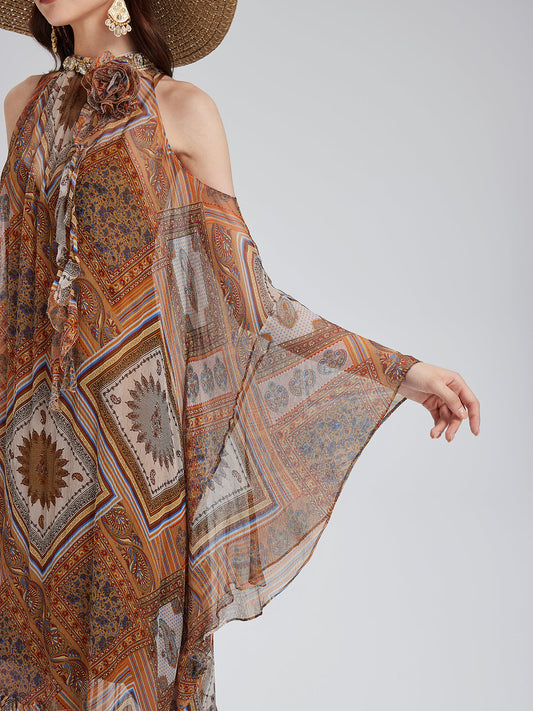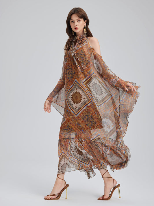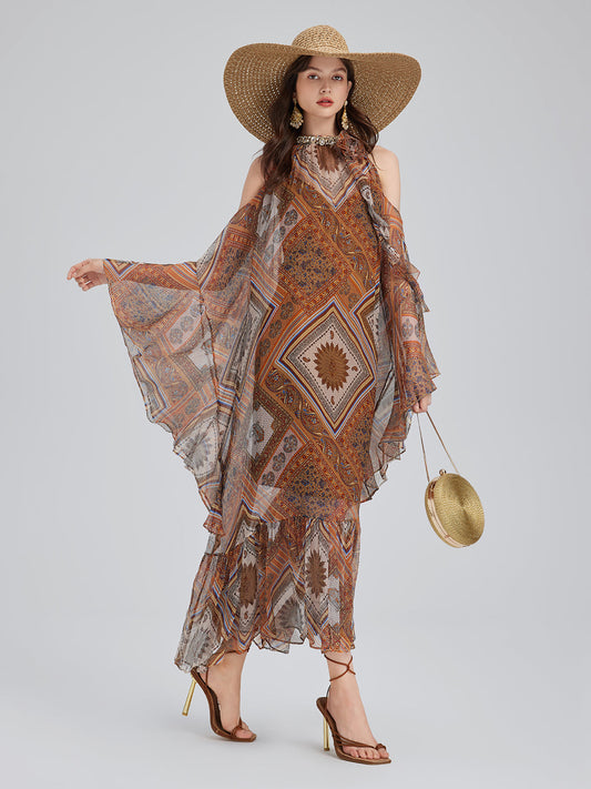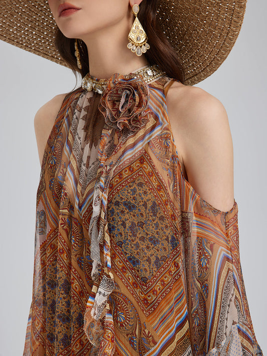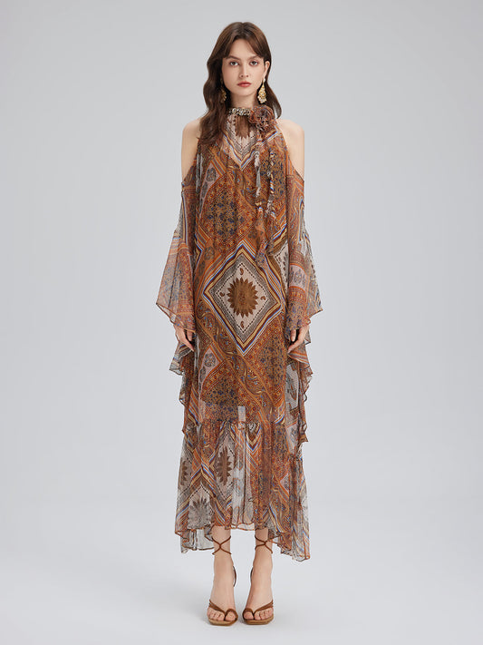 Boncuklu İpek Bohem Baskı Elbise