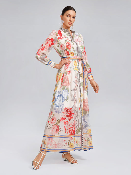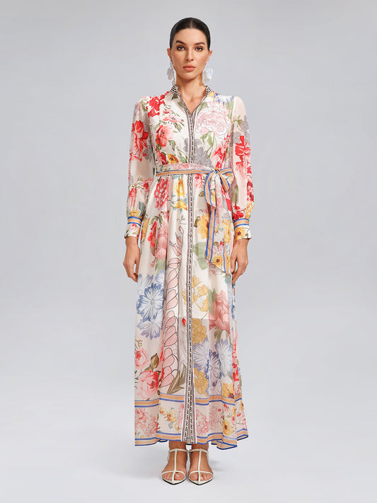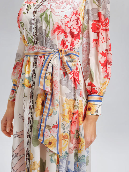 Çiçek Desenli Yüksek Bel Gömlek Elbise