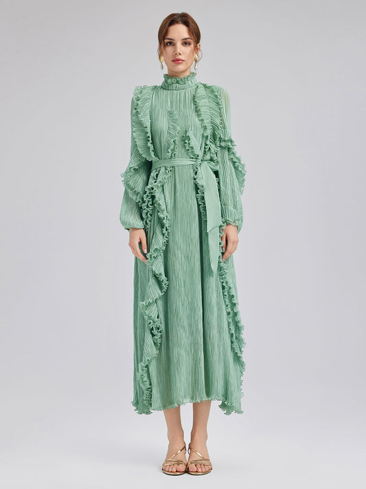 Yüksek Yakalı Pileli Fırfırlı Elbise