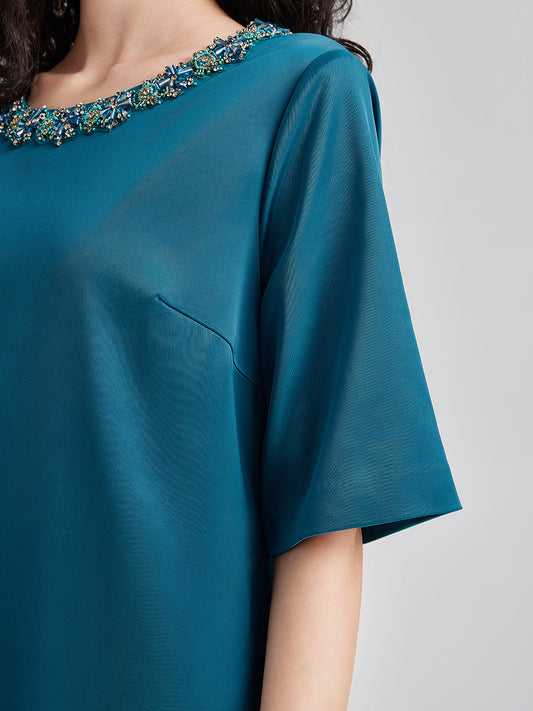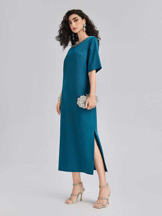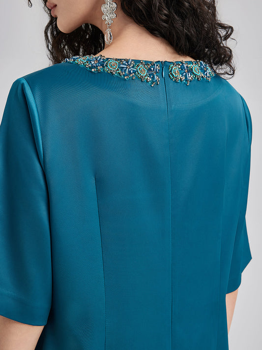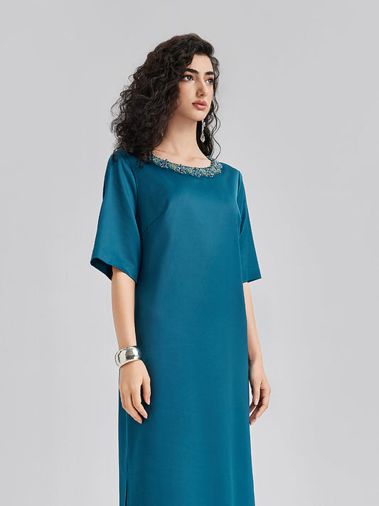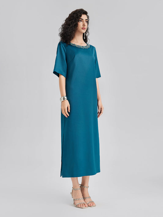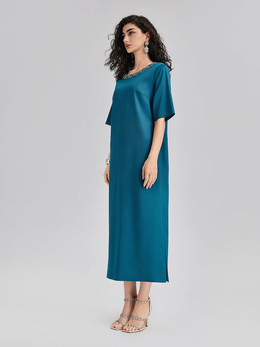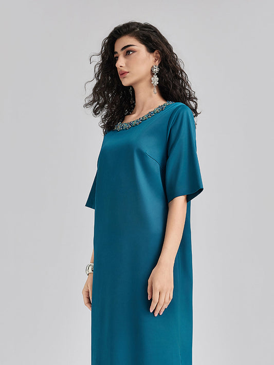 Karmaşık Kristal Süslemeli Zarif Saten Elbise