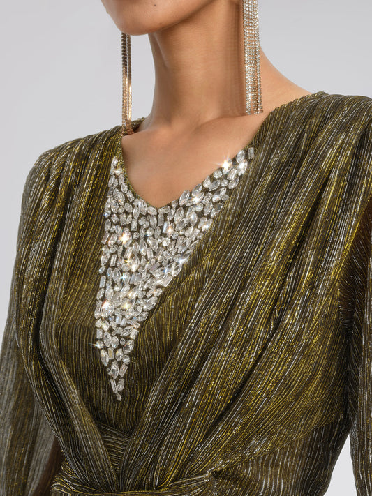 Pileli Lurex Kristal V Yaka Elbise