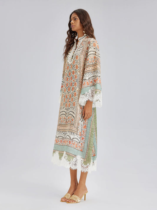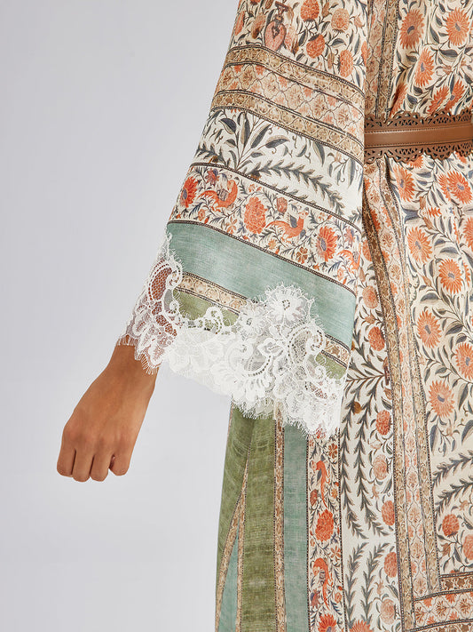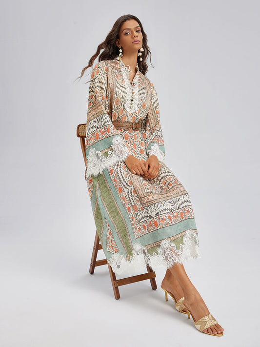 Vintage Botanik Desenli Dantel Elbise (Kemer Dahil)